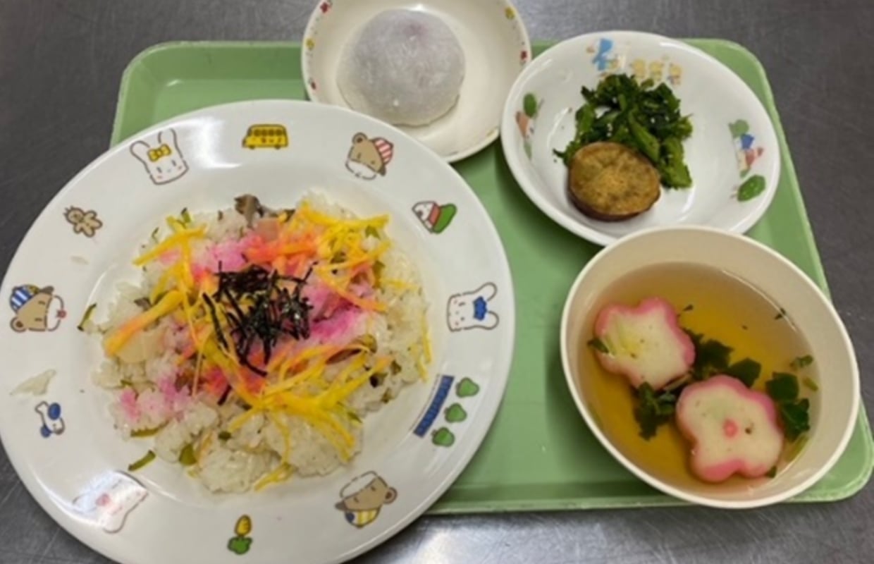 園内で手作りする給食とおやつは子どもたちの毎日の楽しみ です。煮魚やおひたしなどの和食や季節の行事食も献立に 並びます。アレルギー対応食・離乳食の進め方については 保護者の方と話し合いながら進めています。