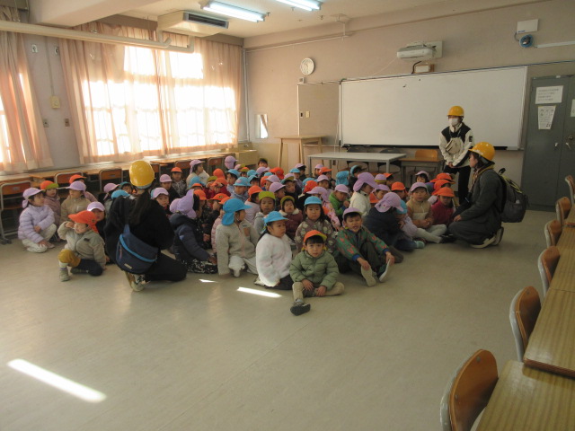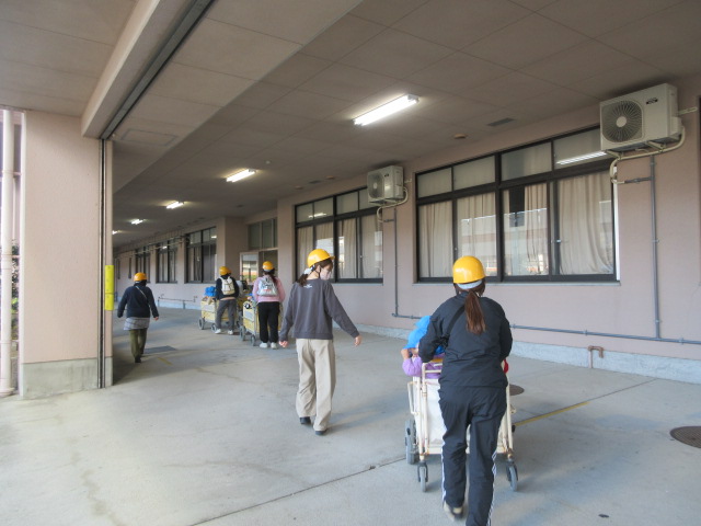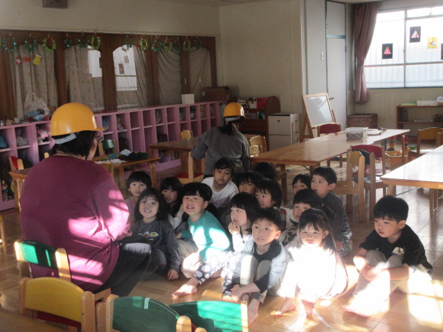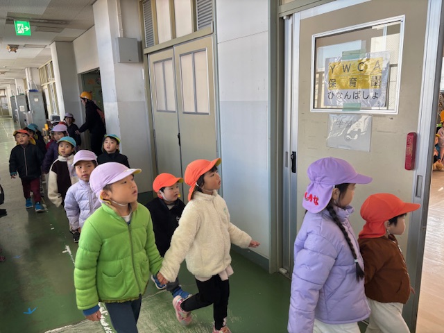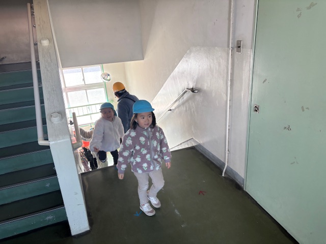 全員無事に避難できてお話を聴いています。 0.1歳児さんは今回は1階までの避難で終わりました。
