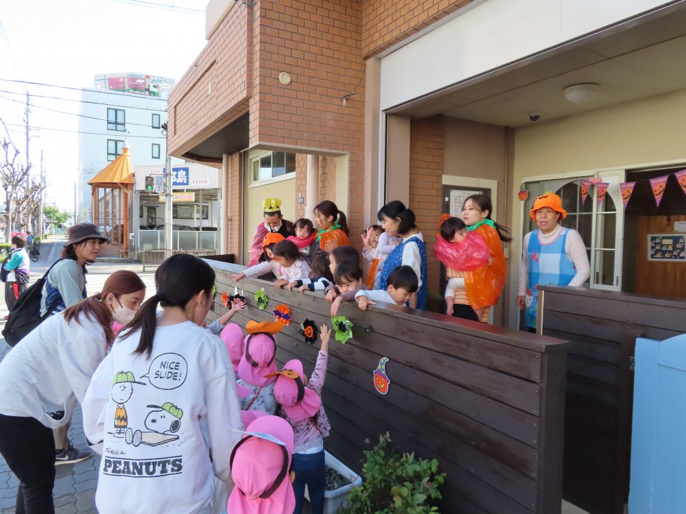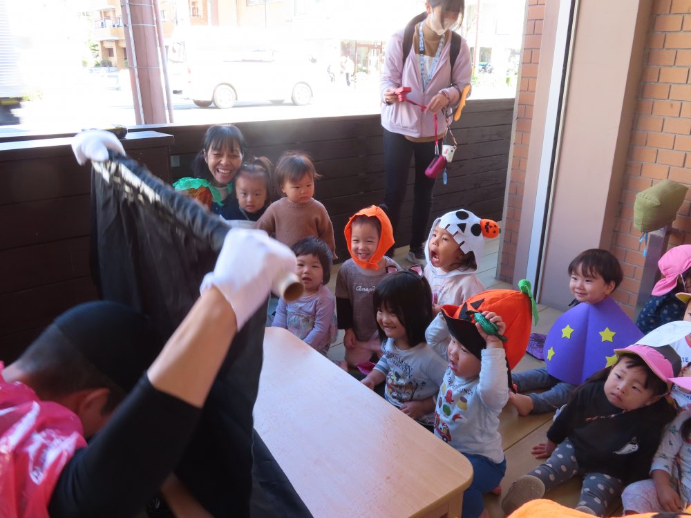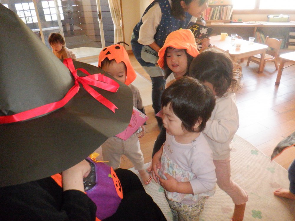 この日は職員も仮装でみんなの仲間入り。「ハッピーハロウィン!」と、魔女からお菓子をもらうおともだち。