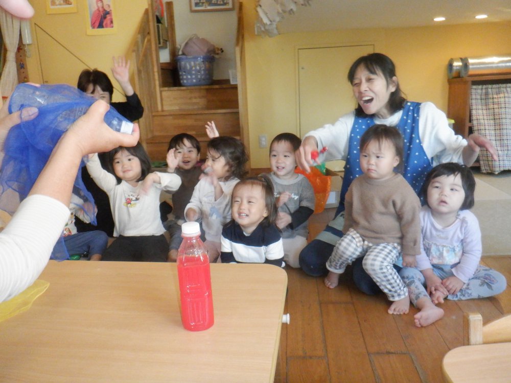 保育士が準備したマジックショーをみんなで楽しみました。「アブラ カタブラ~」とみんなで呪文の言葉を唱えると、あら、不思議!透明の水が、イチゴ水の赤色に!