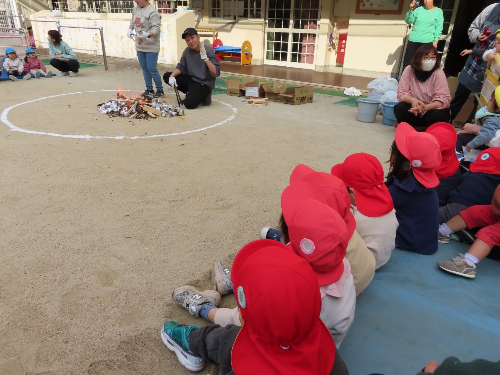 せんせい、たき火の番、がんばって~