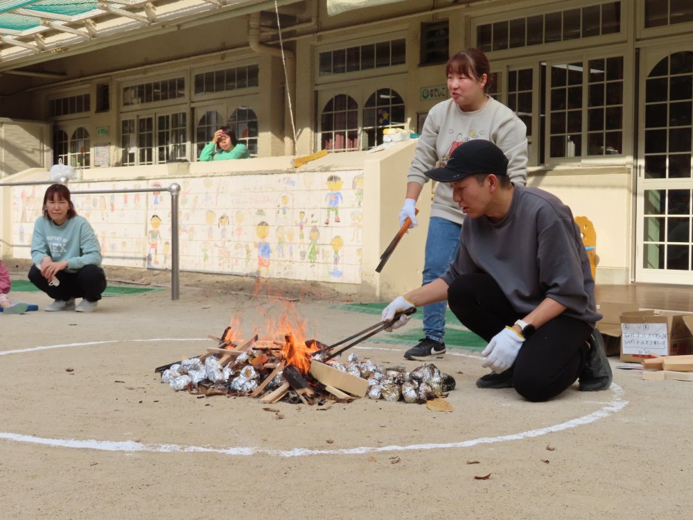 たき火にお芋を投げ入れて、やきいもにするよ!