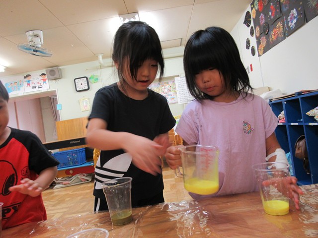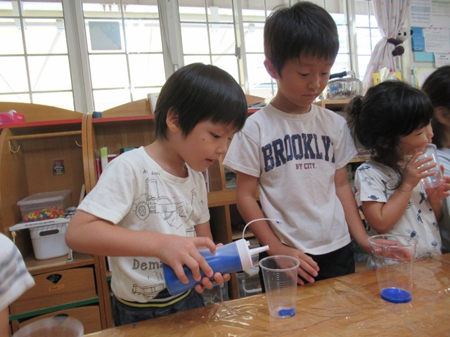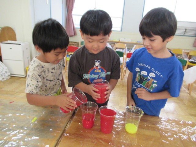 赤・青・黄色の色水でジュース作りが始まりました。赤はイチゴ味。黄色はレモン味。お友だちのジュースと混ぜて、ぶどうジュースも作ることができましたよ。